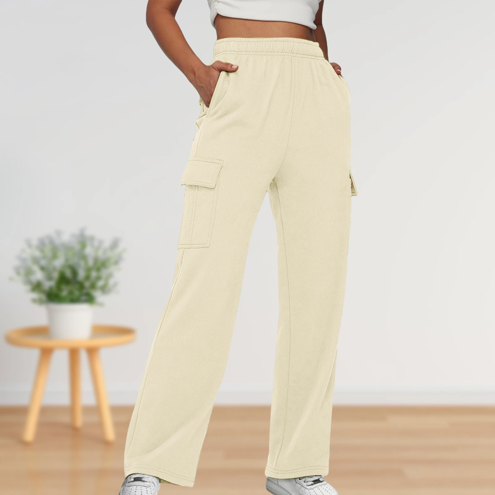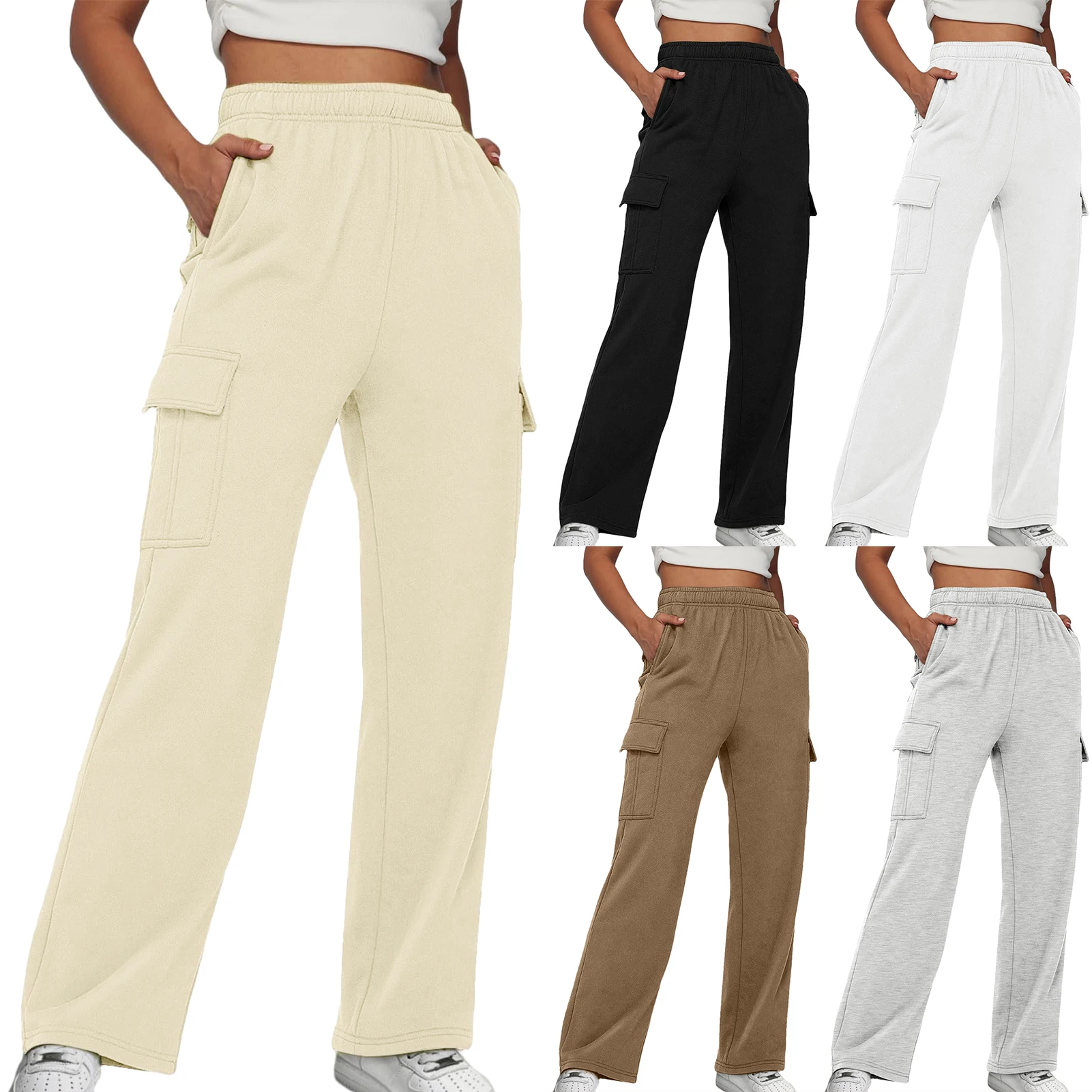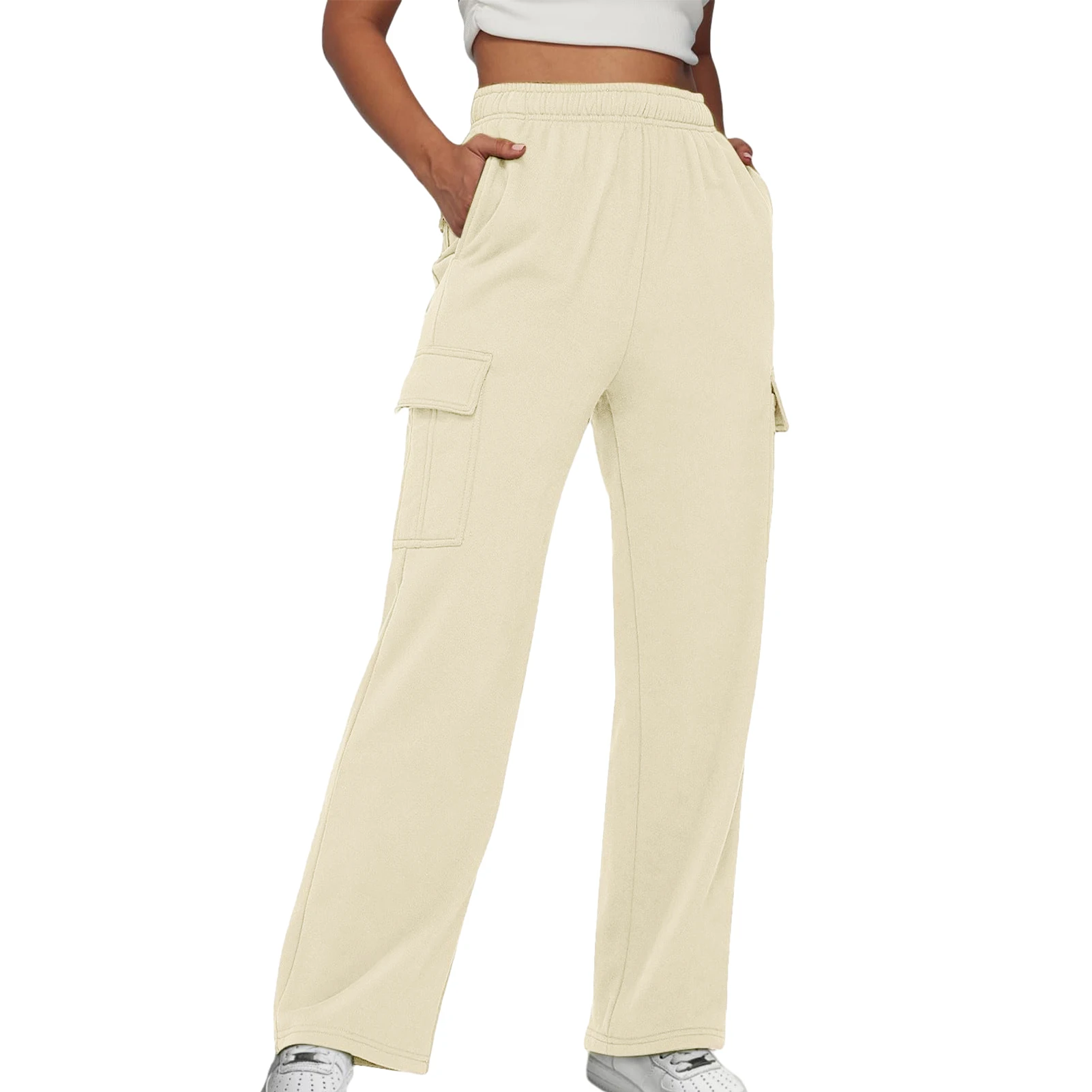 Elastic Waist Basic Sweatpants Pockets Women Straight Leg Pants Loose Fit High Waist Pants Plus Size Sport Style Streetwear Suit