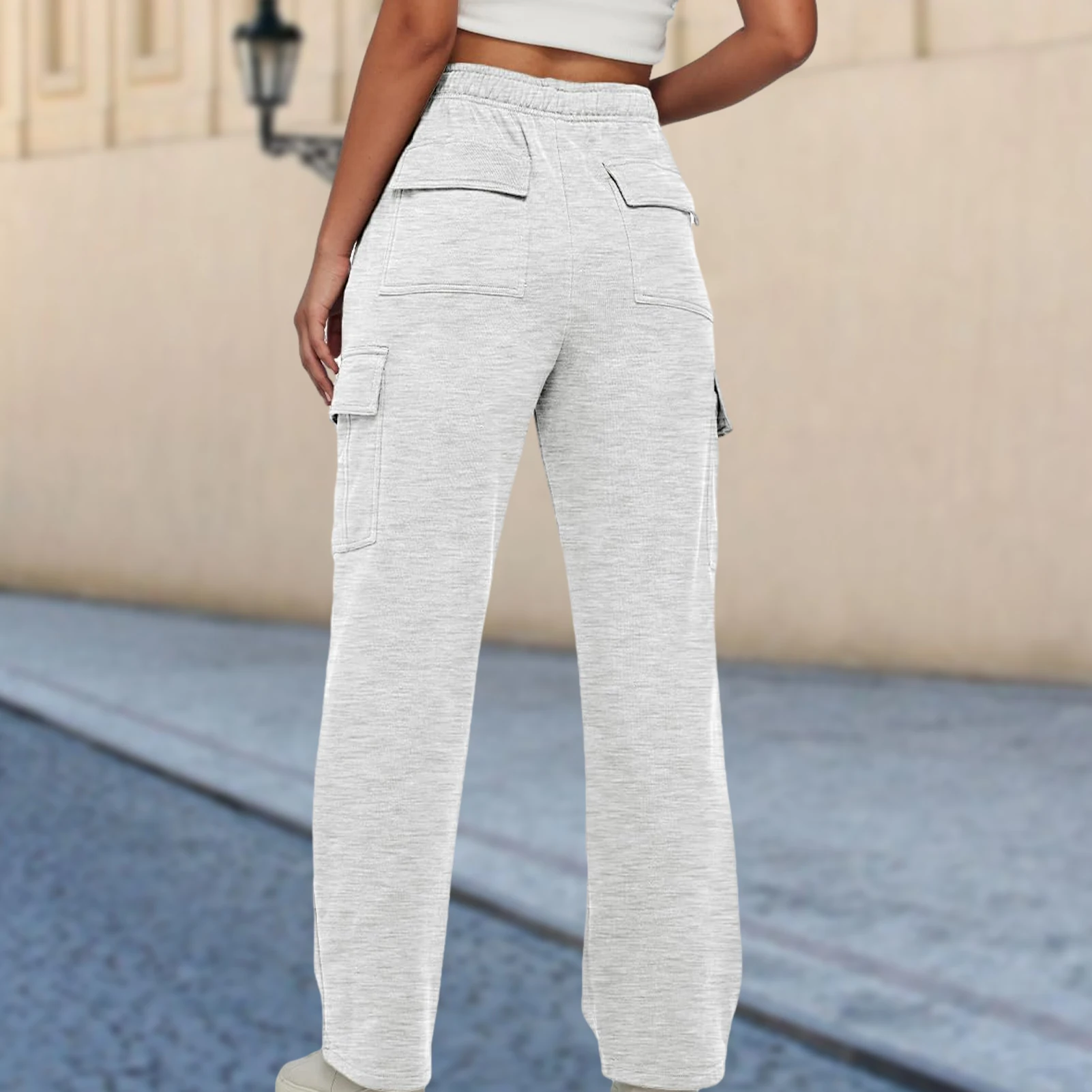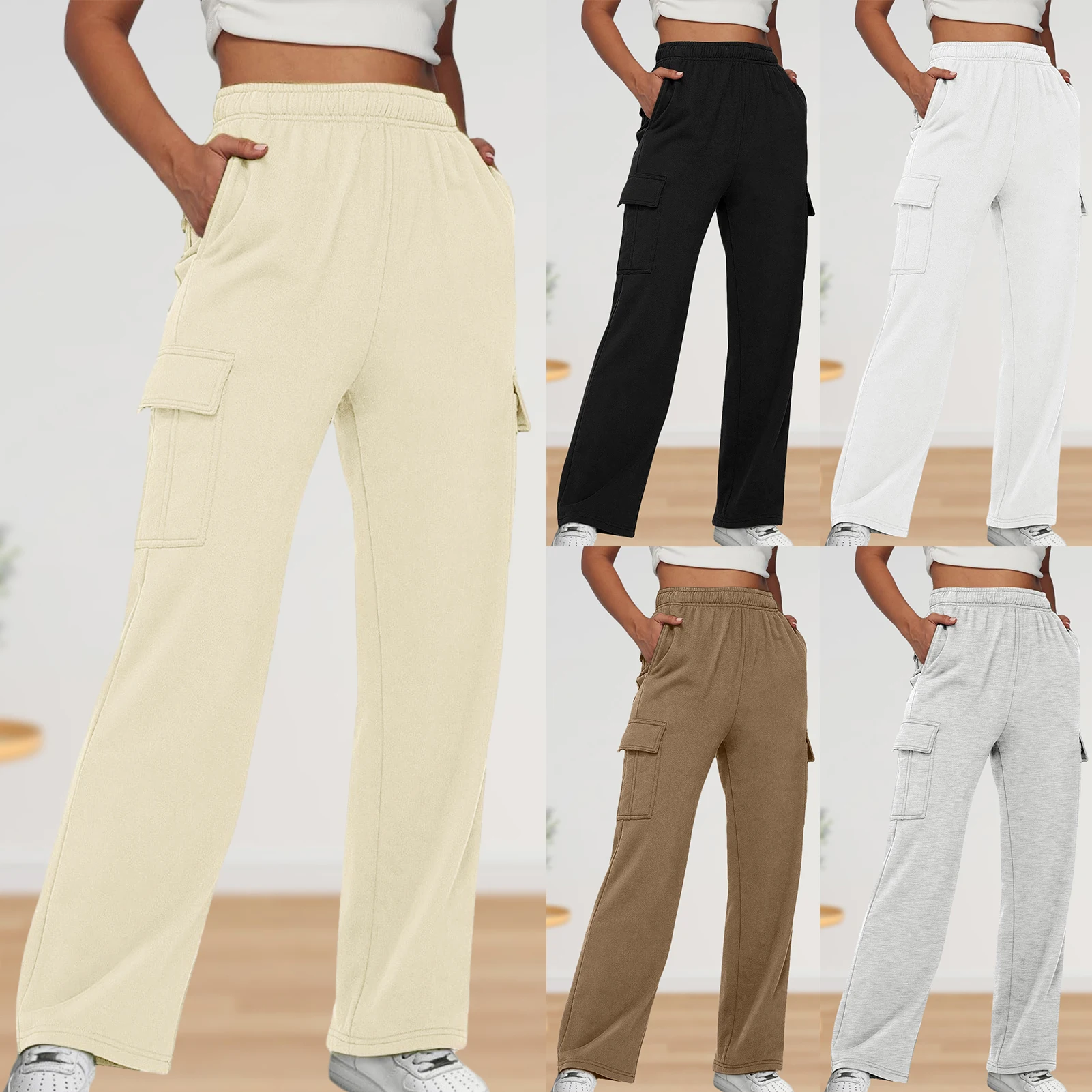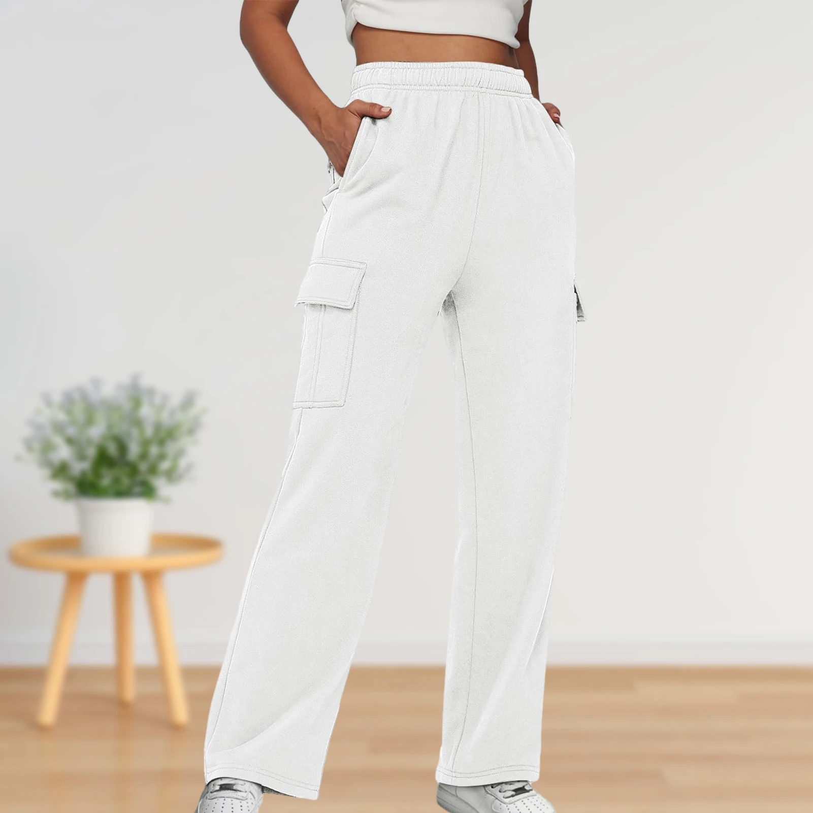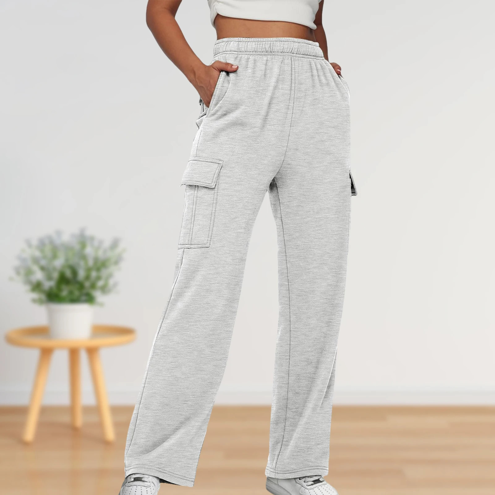 Elastic Waist Basic Sweatpants Pockets Women Straight Leg Pants Loose Fit High Waist Pants Plus Size Sport Style Streetwear Suit