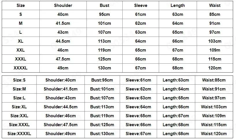 | Size:XXXXL | Shoulder:49cm | Bust:130cm | Sleeve:67cm | Length:68cm | Waist:120cm |
