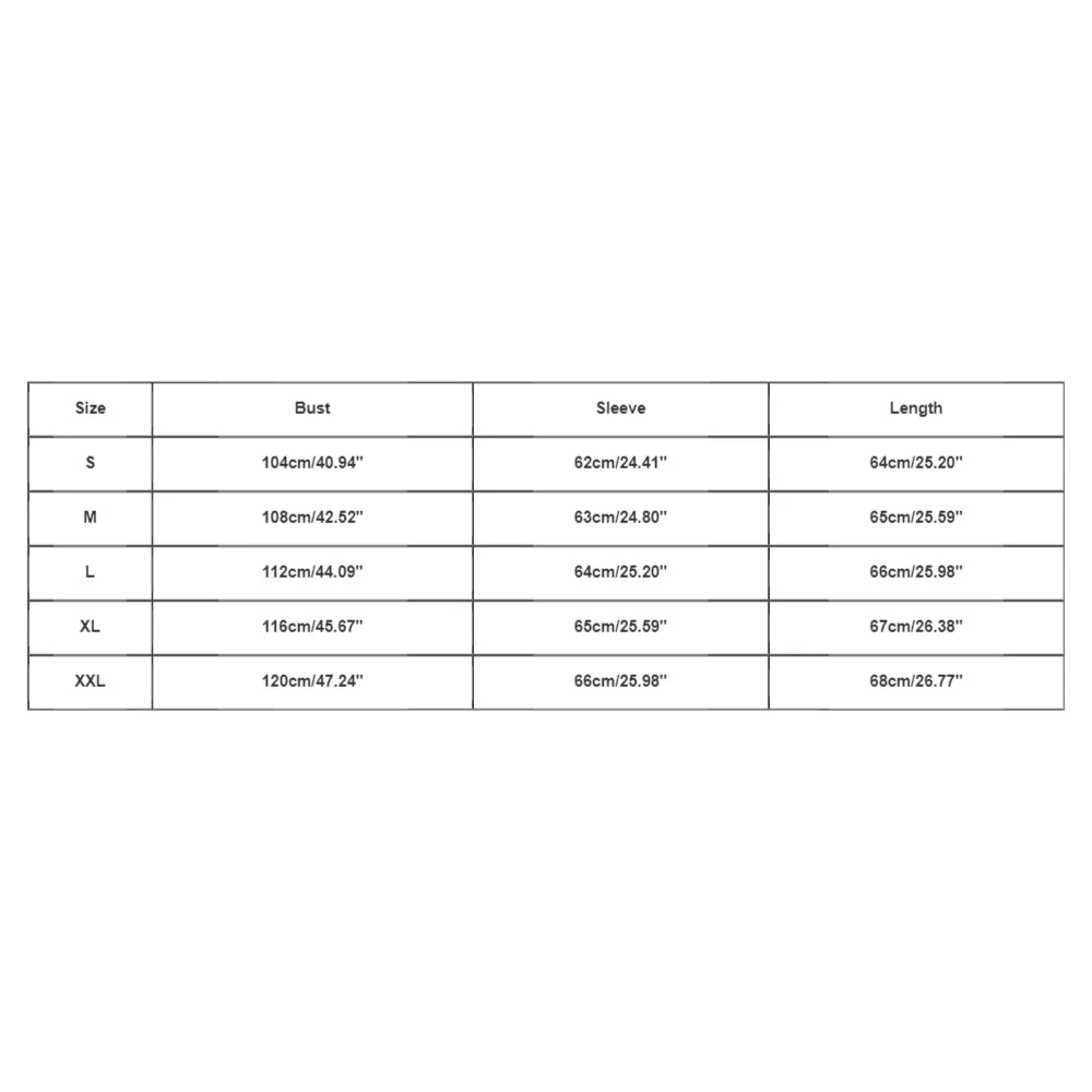 | Size:XXL | Bust:120cm/47.24'' | Sleeve:66cm/25.98'' | Length:68cm/26.77'' |