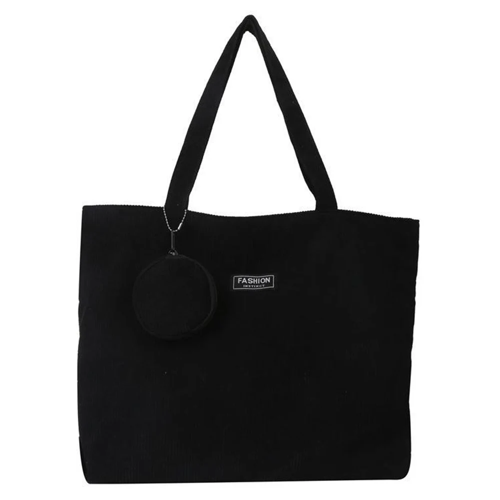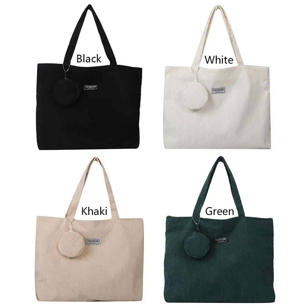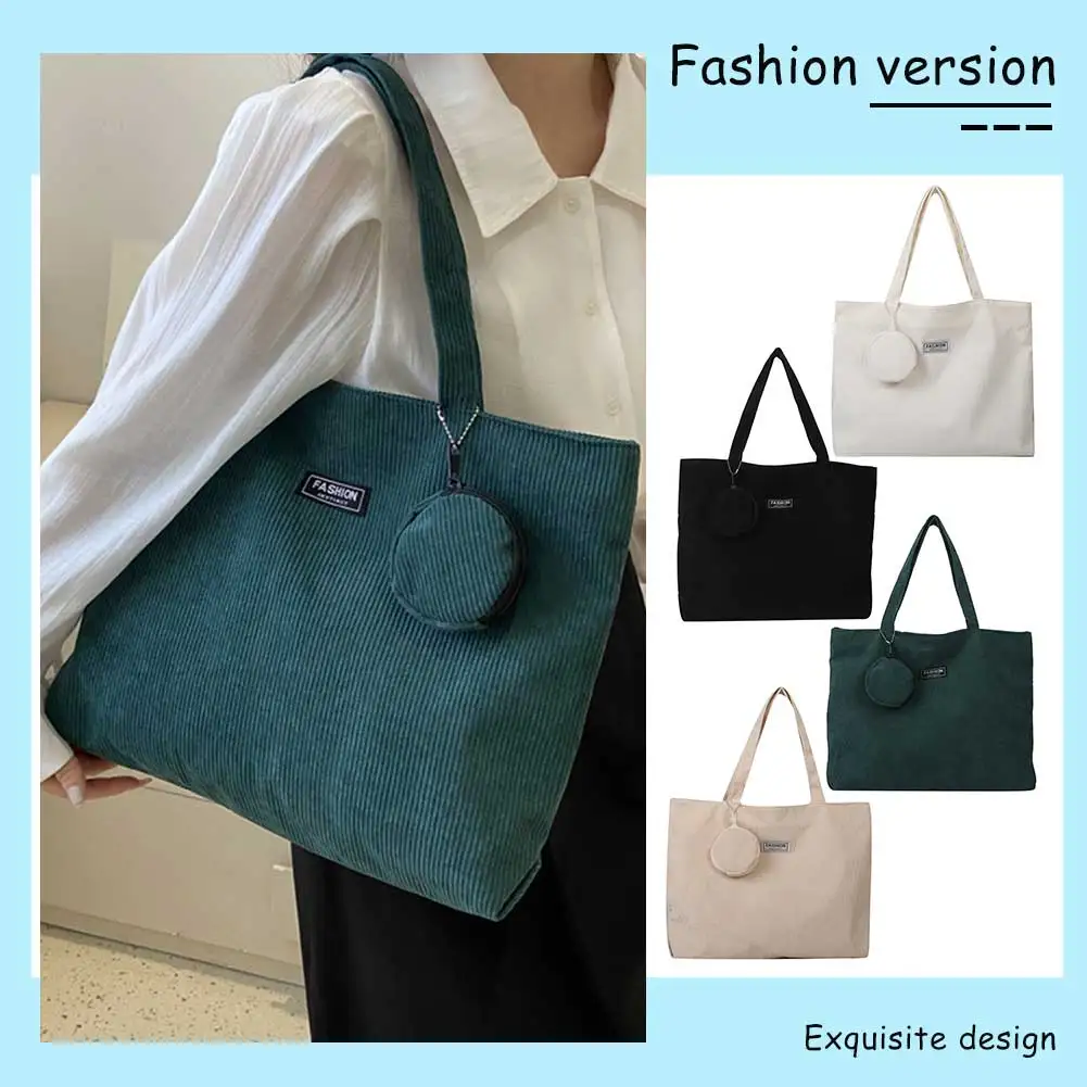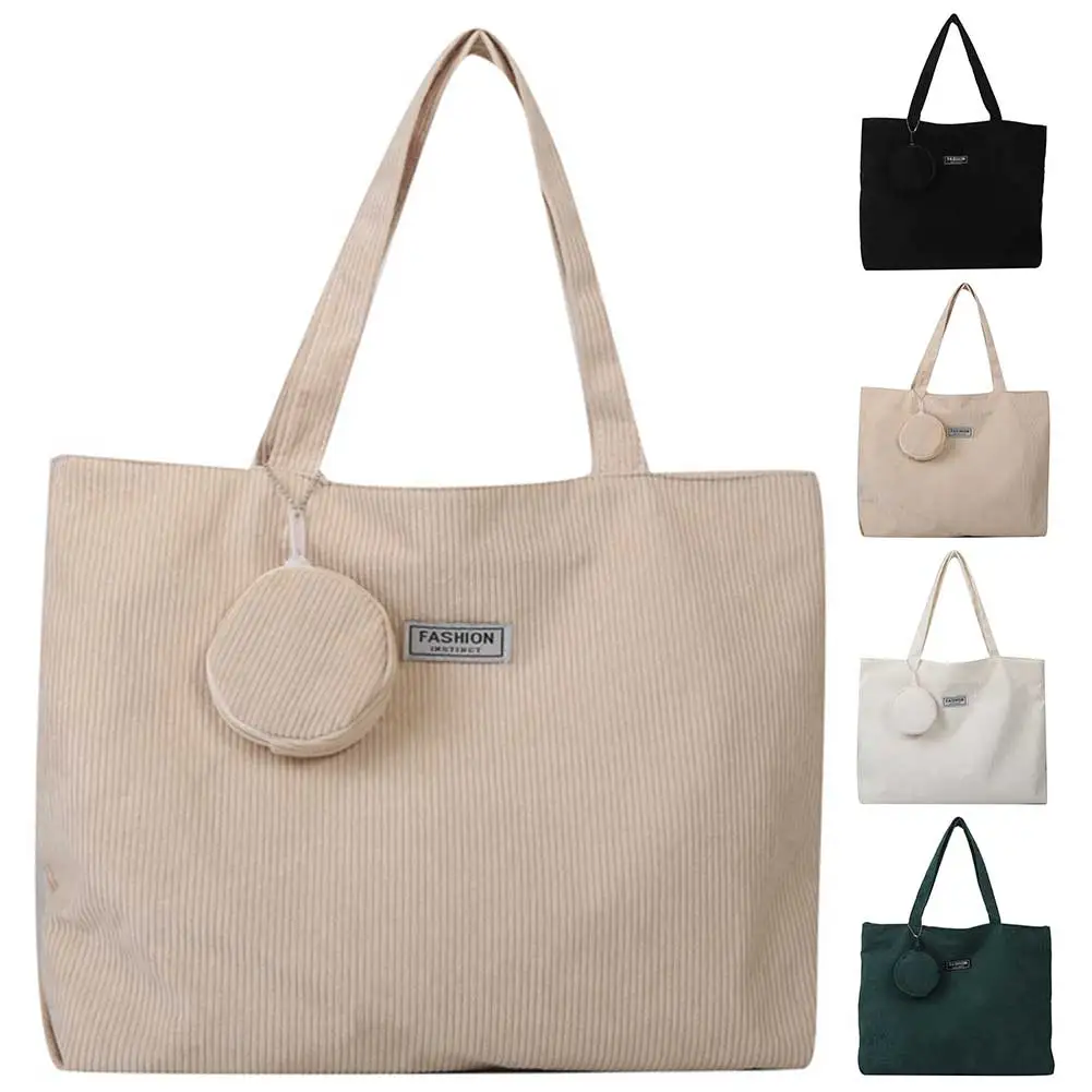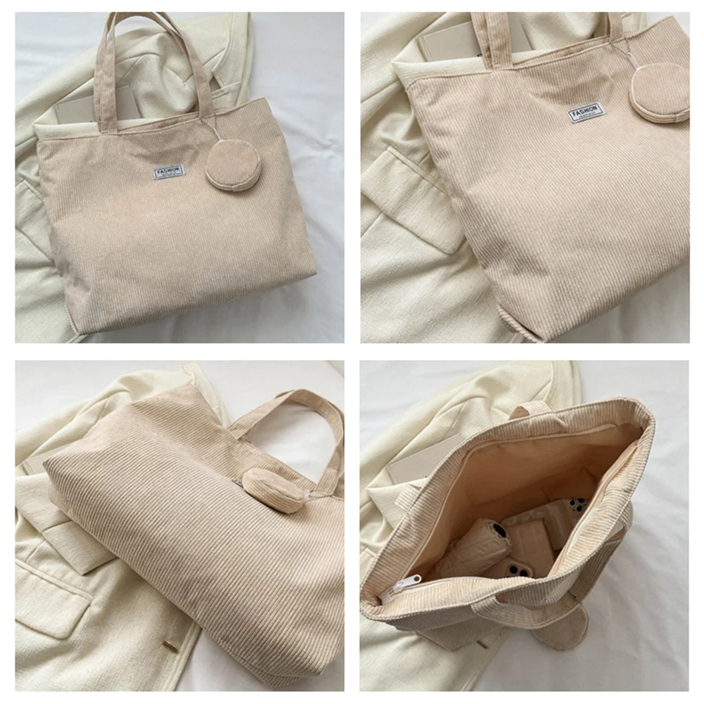 Women Corduroy Tote Handbag Zipper Hobo Bag Foldable Shoulder Bag with Coin Bag Large Capacity Casual Satchel Bag