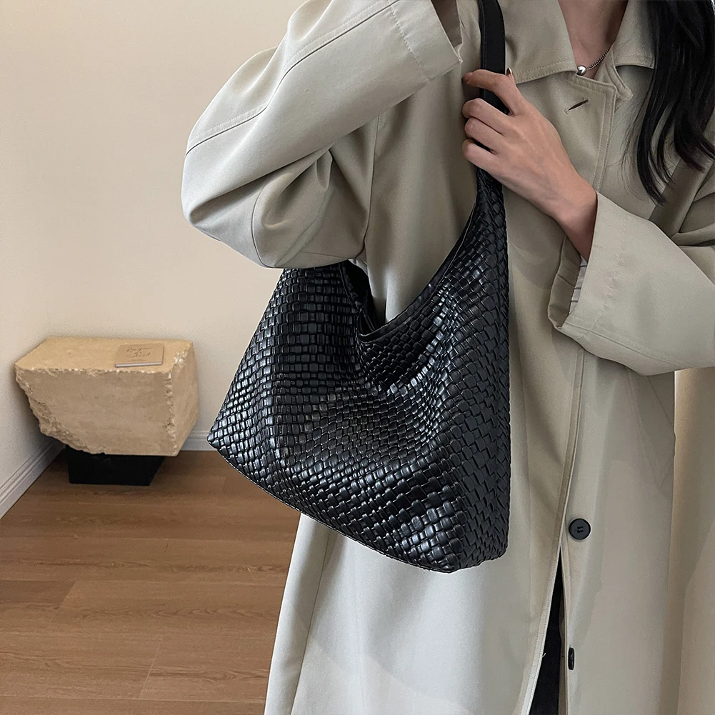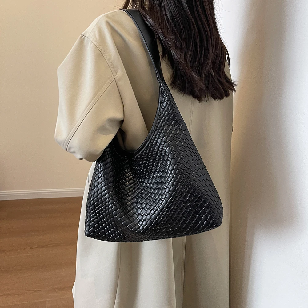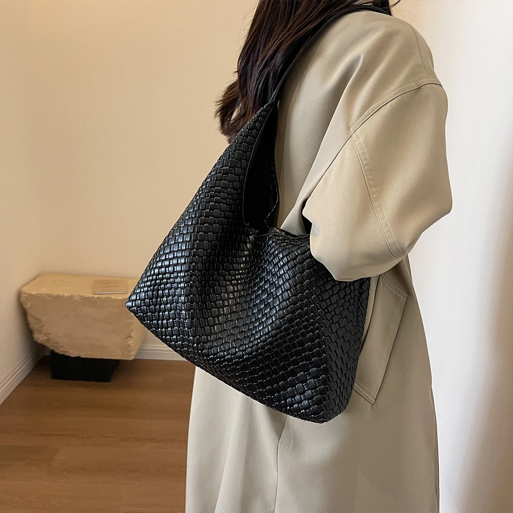 PU Leather Woven Tote Bag Women Large Shoulder Satchel Hobo Bag with Pouch Casual Top Handle Bag Armpit Handbag Shopping Bag