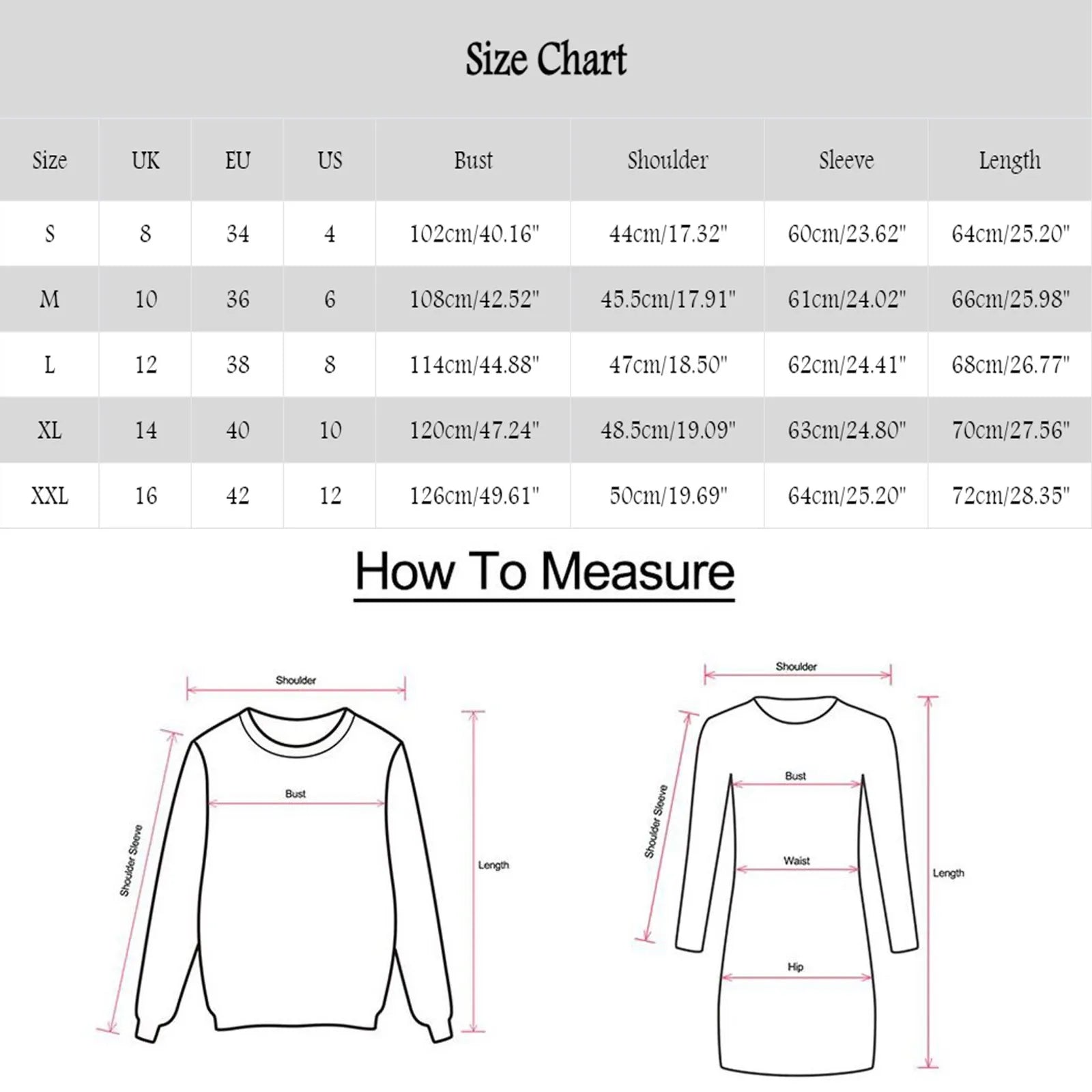 | Size:XL | UK:14 | EU:40 | US:10 | Bust:120cm/47.24'' | Shoulder:48.5cm/19.09'' | Sleeve:63cm/24.80'' | Length:70cm/27.56'' |
